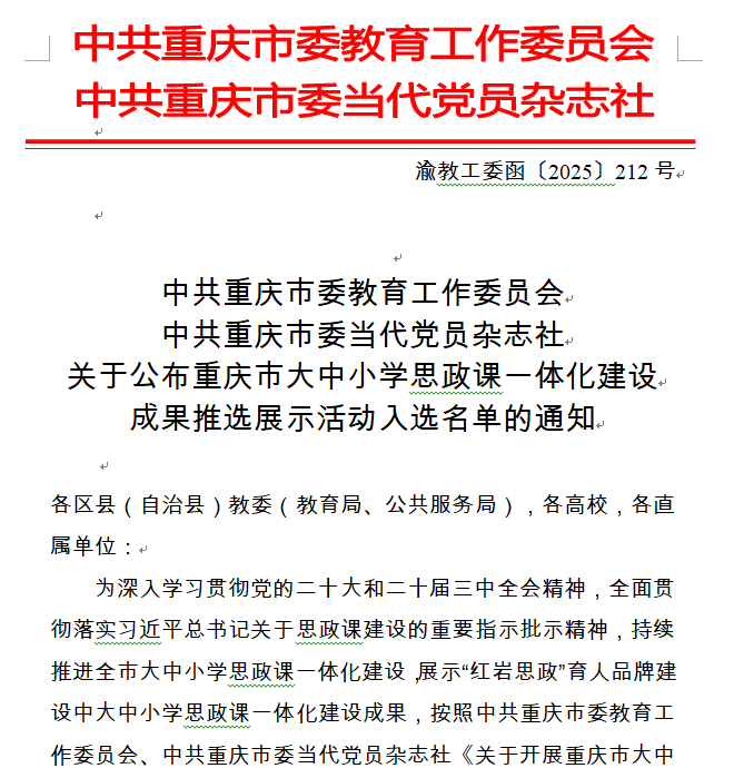 今年上半年,重庆市教委先后举办了大中小学国家安全教育优质课大赛及思政课一体化建设成果推选活动。近日,两项活动评选结果在重庆市教委发布的渝教安函〔2025〕27号和渝教工委函〔2025〕212号文件中予以公布,我校均荣获佳绩,充分彰显了我校在大中小学思想政治教育一体化建设中的综合实力与育人成效。