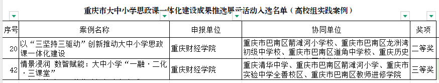 张玉勤老师主笔撰写的《以“三坚持三驱动”创新推动大中小学思政课一体化建设》荣获高校组实践案例二等奖;陈开江老师主笔撰写的《情景浸润·数智赋能:大中小学“一融·二化·三课堂”“红岩铸魂”一体化建设探索与实践》荣获高校组实践案例三等奖。