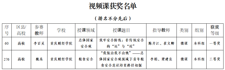 | 重庆市大中小学国家安全教育优质课大赛重财获奖情况截图 |