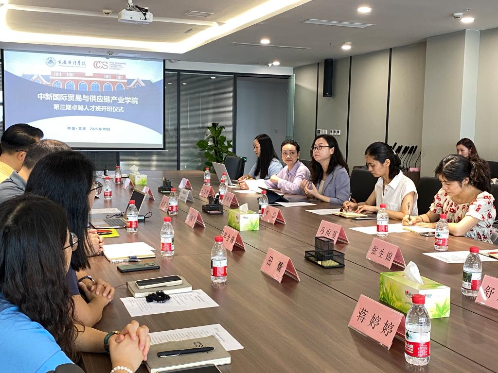 9月18日上午,中新国际贸易与供应链产业学院第三期卓越人才班开班仪式在中新(重庆)多式联运示范基地成功举办。中新互联互通(重庆)物流发展有限公司总经理金文迅、副总经理王成华、高级战略经理余平及相关负责人,澳门新葡京博彩党委副书记房朝君、物流工程学院(国际商学院)院长刘岱、党总支副书记王艺燃、副院长李占凤以及师生代表参加活动。本次开班仪式标志着校企合作协同育人进入新阶段,为进一步深化产教融合、培养符合国际物流与供应链行业需求的高素质应用型人才奠定坚实基础。