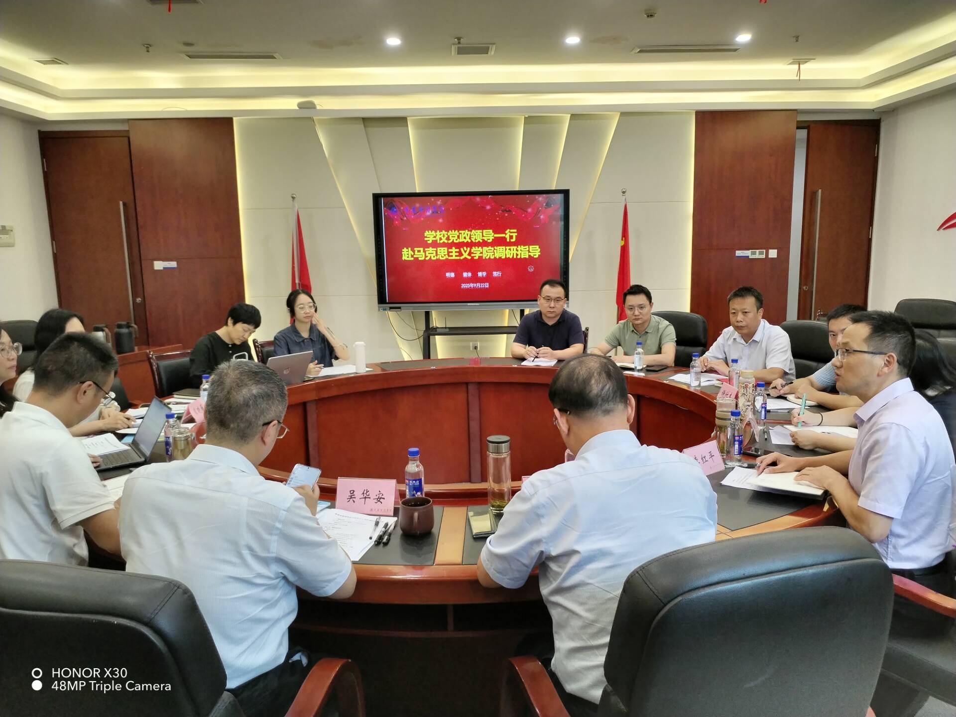9月22日下午,学校党委书记张毅、校长吴华安、副校长崔中山一行,在行政楼2302会议室对马克思主义学院进行党政专题调研。党政办公室、组织人事部、教务处、财务处等职能部门负责人陪同调研。马克思主义学院院长常晓薇、各教研室主任、骨干教师与新进教师代表参加座谈。会议由教务处处长李红平主持。