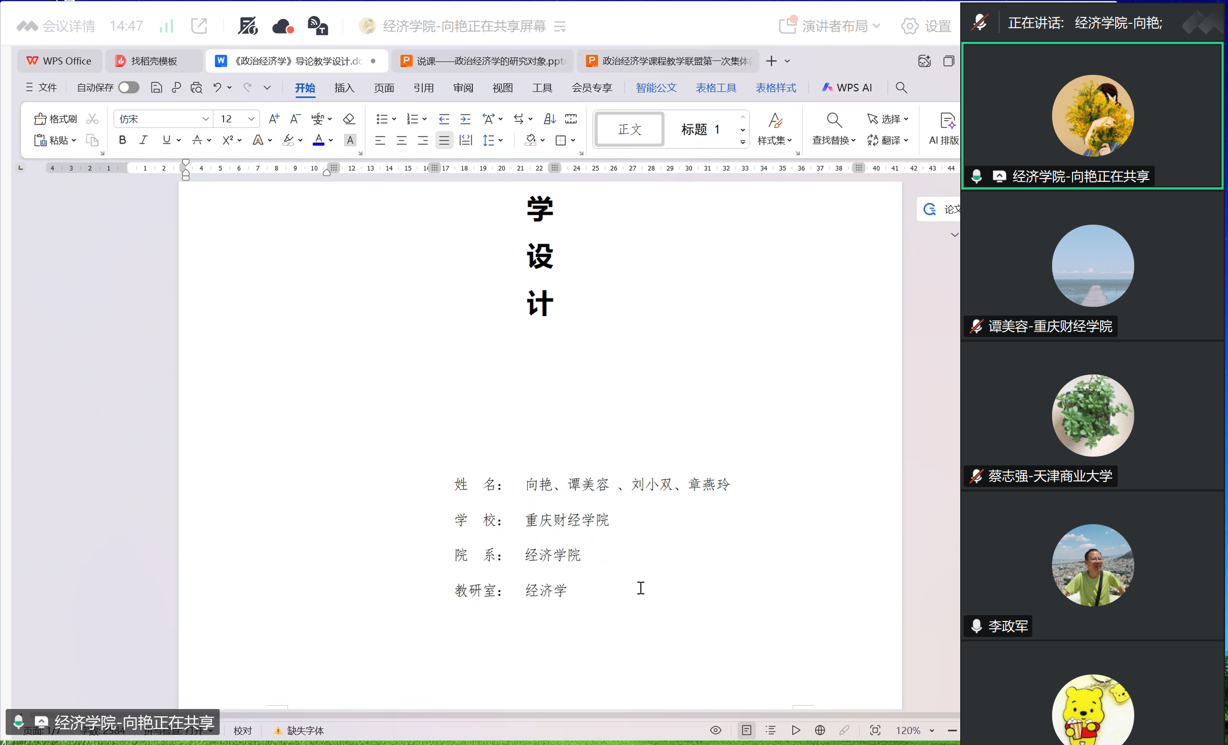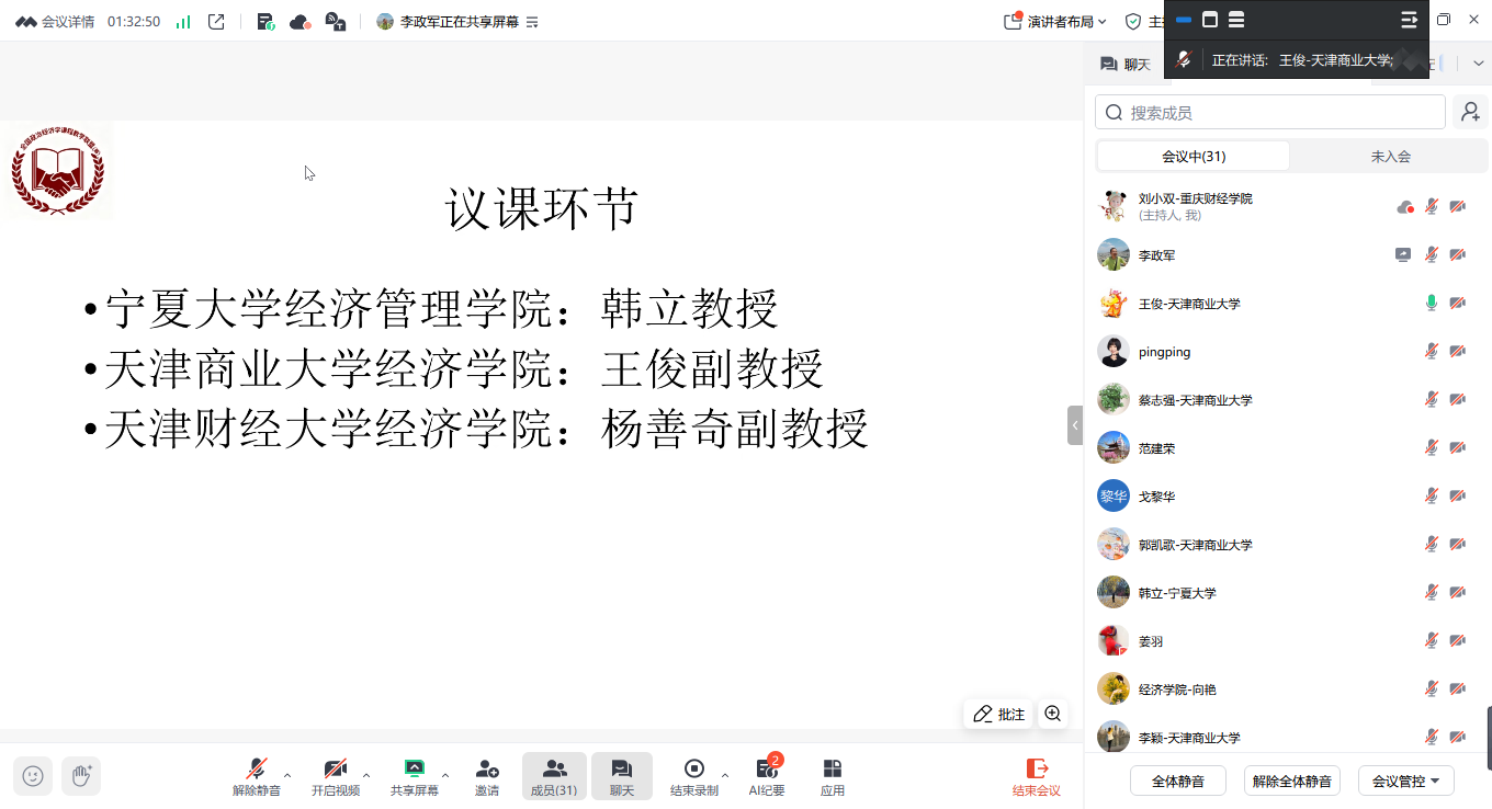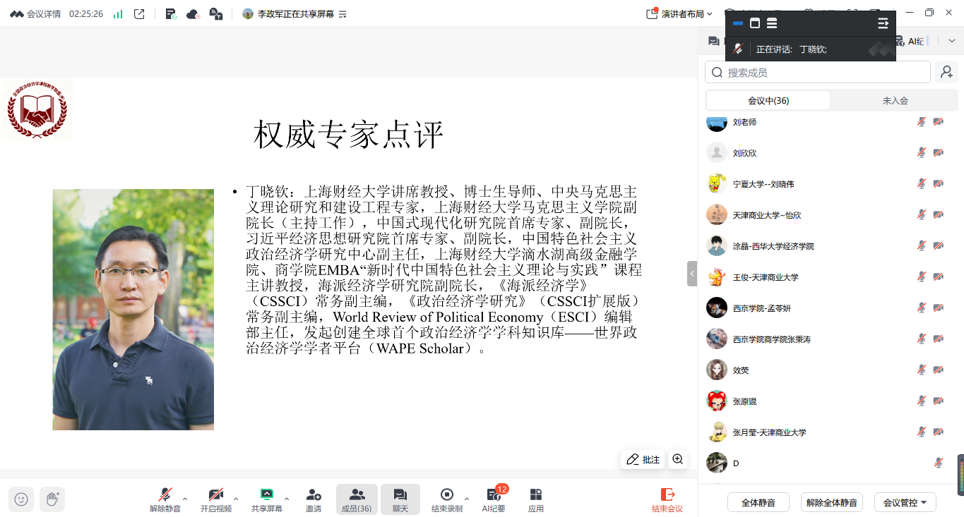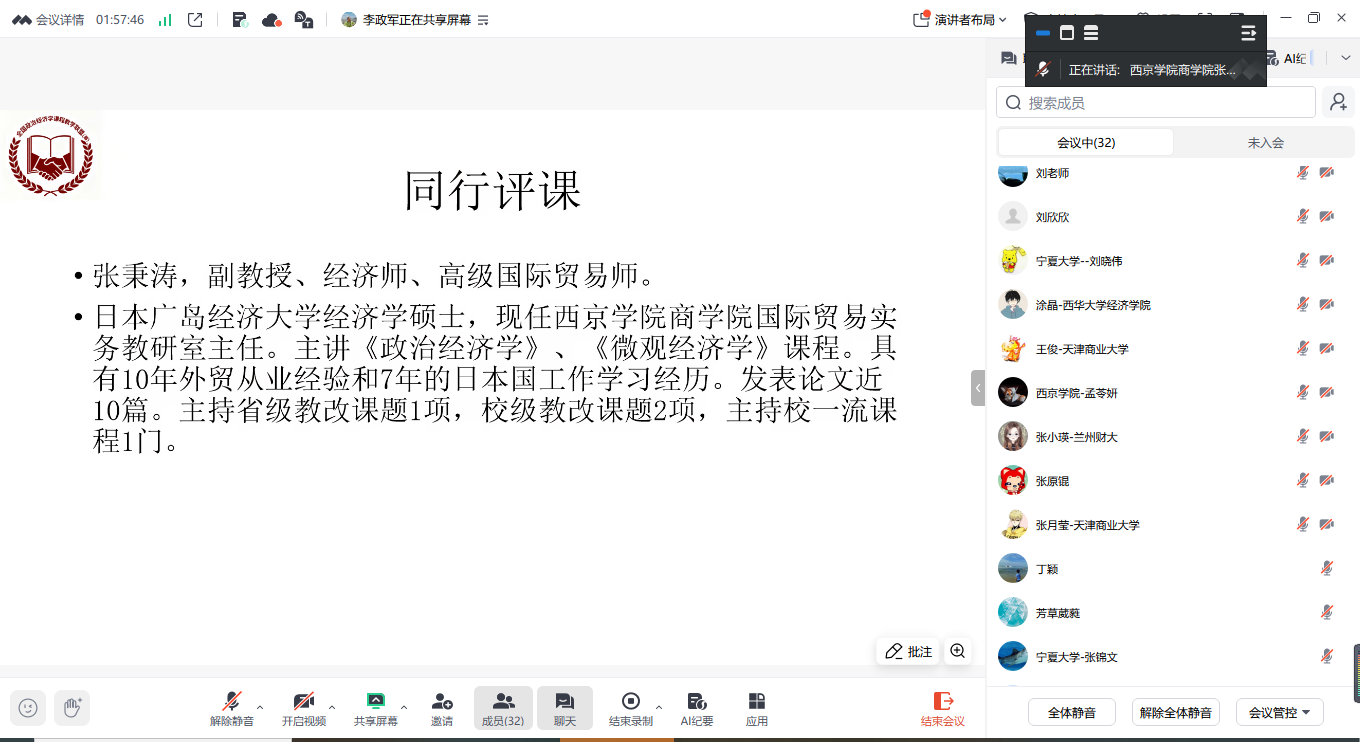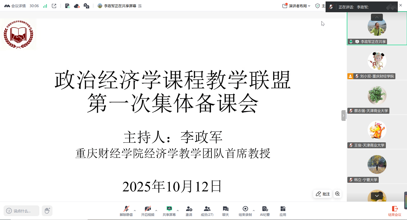 10月12日下午2点到4点,我校市级经济学课程群虚拟教研室联合宁夏大学、天津商业大学、天津财经大学、北方民族大学、西华大学、兰州财经大学、西京学院等全国八所高校的42位教师,相聚在腾讯会议(会议号:890-784-336),对本科《政治经济学》课程“导论”章节进行首次集体备课,旨在通过跨校协作与智慧共享,探索教学方法与教学改革,共同提升教学质量,应对教学挑战。此次会议由我校市级经济学课程群虚拟教研室负责人、校经济学教学团队首席教授李政军主持,上海财经大学马克思主义学院副院长丁晓钦教授应邀参加了此次会议。