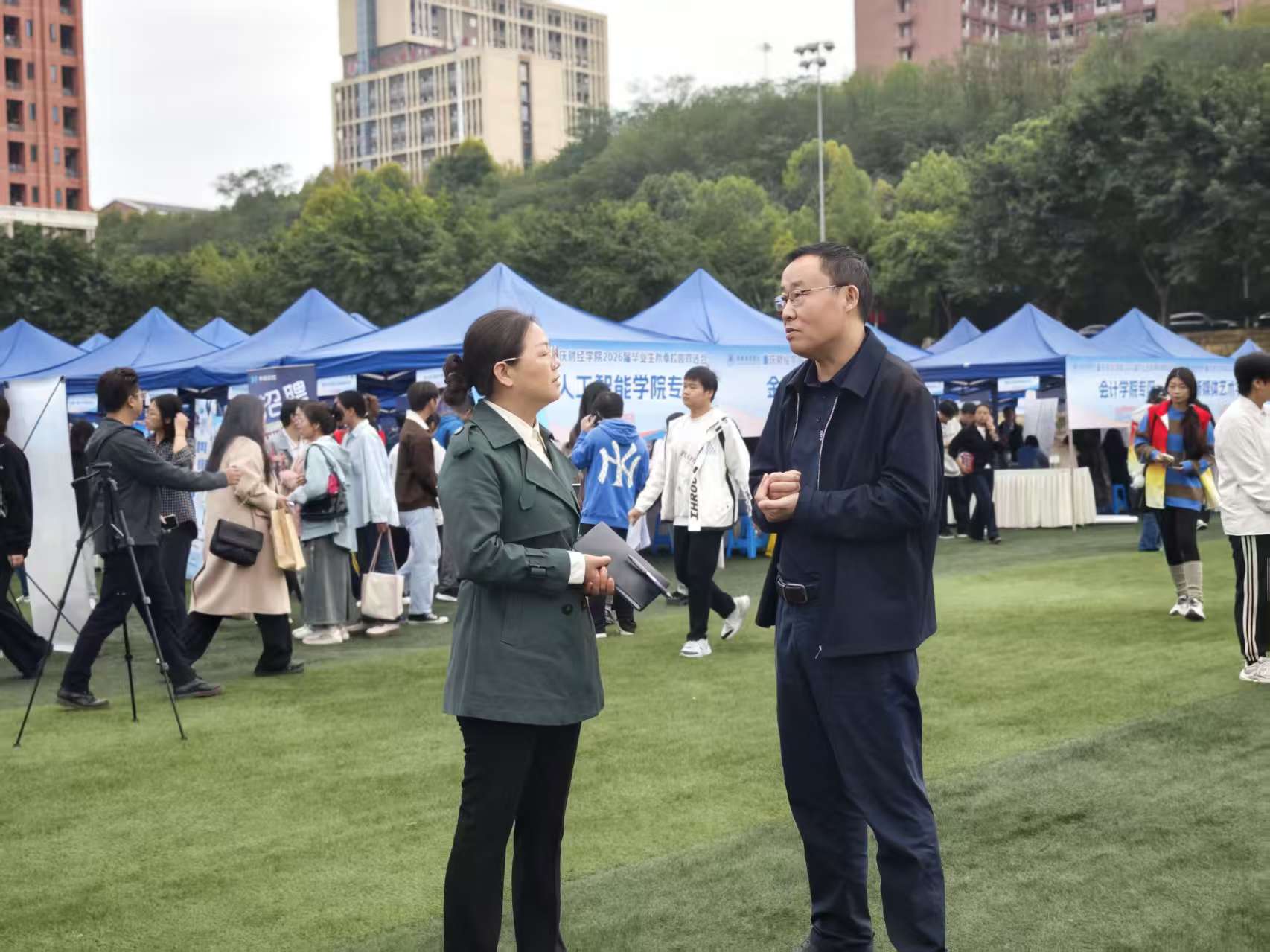10月24日,正值我校2026年秋季校园双选会之际,重庆市巴南区医疗保障局副局长余娟率队到我校考察调研,深入开展大学生医保政策宣传与指导工作。对区医保局、区税务局一行到双选会现场为学生提供精准的医保政策宣传与业务指导,学校副校长李春雷表示热烈欢迎和衷心感谢。