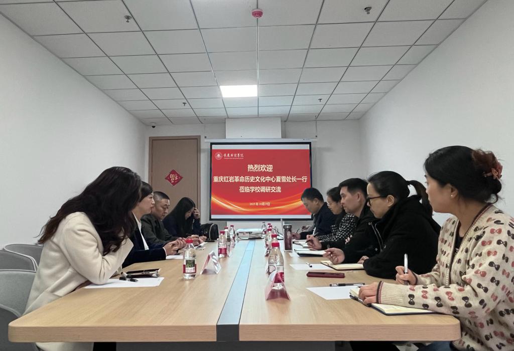 为推进“红岩思政”育人品牌建设,提升组织育人质量,10月29日下午,重庆红岩革命历史文化中心宣传教育处副处长罗雪一行到校开展调研交流。校党群工作部部长甘雪梅、学生工作部部长李刚热情接待罗副处长一行。
