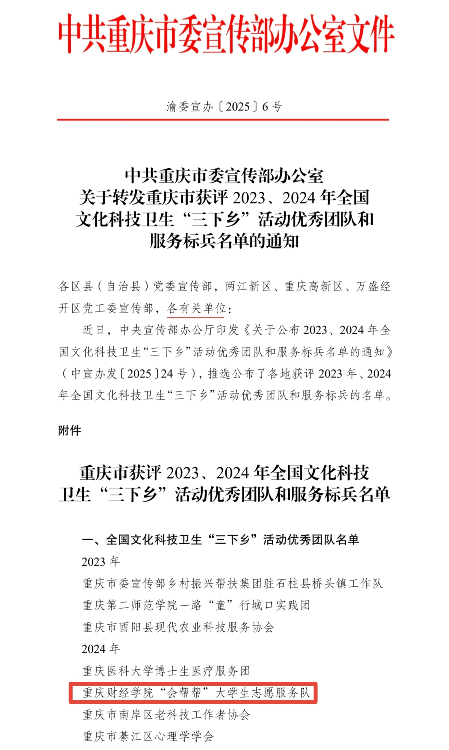 近日,中央宣传部办公厅印发了关于公布20232024年全国文化科技卫生“三下乡”活动优秀团队和服务标兵名单的通知》。在2024年度的评选结果中,重庆市共4个团队获评优秀团队称号,我校“会帮帮”大学生志愿服务队成功入选,系该年度重庆市高校唯一获此殊荣的本科生团队。