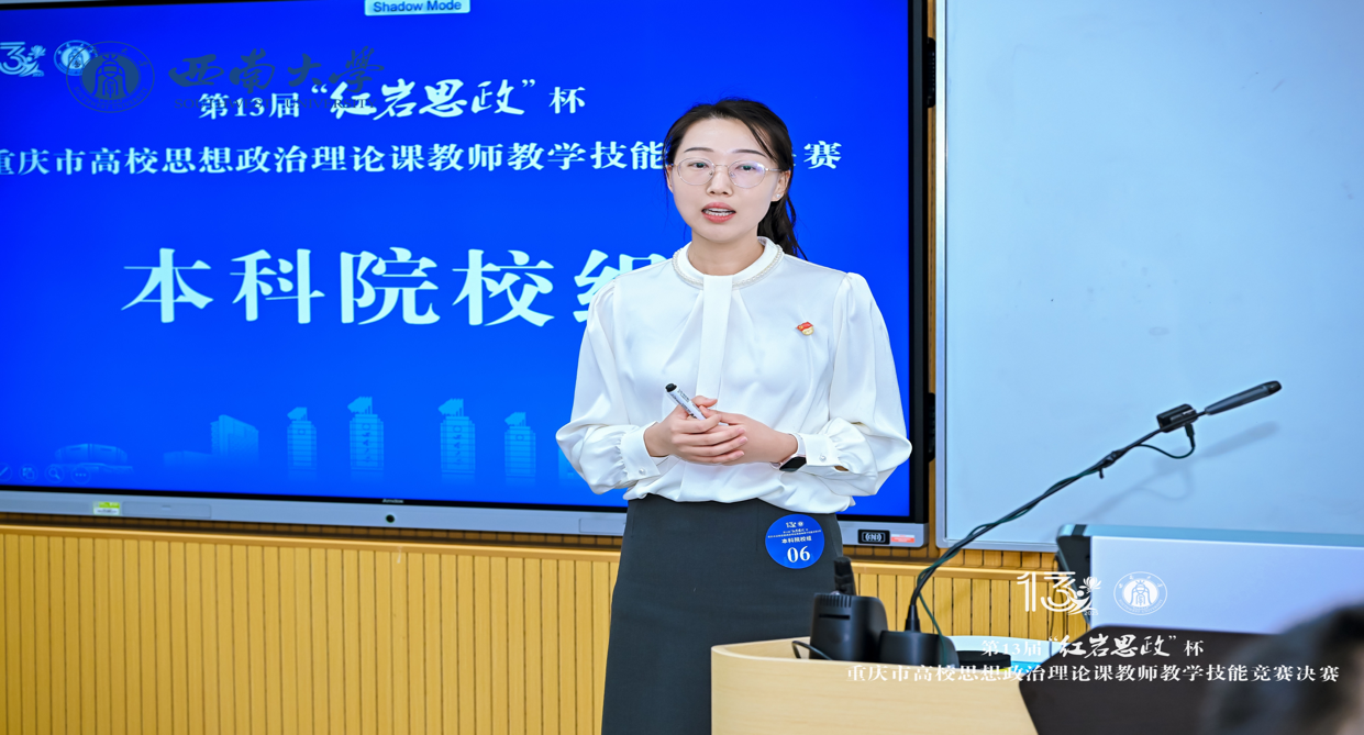 作为重庆市提升高校思政课教学质量、锤炼教师队伍的核心平台,此次“红岩思政”杯竞赛汇聚全市各高校优秀思政课教师同台竞技。我校高度重视此次赛事,通过“全员展示筛选+校外专家评审指导”的两轮校级选拔优中选优,确定参赛人选晋级市级复赛;两位老师在市级复赛中脱颖而出后,继续深耕细研、打磨教学,最终成功闯入市级决赛并荣获二等奖。备赛全程,两位老师充分展现了我校思政课教师过硬的专业素养。
