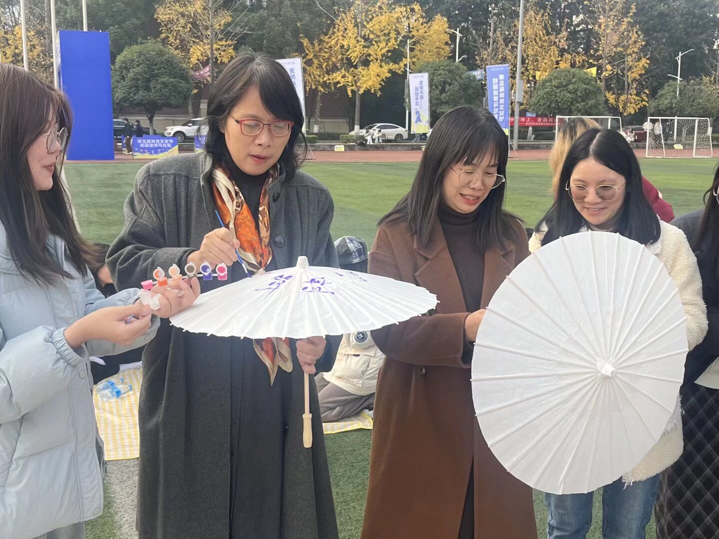 在油纸伞彩绘体验环节,活动氛围达到高潮。陈旭副校长走进同学们中间,与大家并肩创作、亲切畅谈,亲手在素色伞面上描绘算盘、古钱币、账本等传统财会符号。师生携手将抽象的会计概念转化为灵动的艺术表达,一把把油纸伞不仅承载着同学们的创意巧思,更凝结着师生间的深厚情谊,成为专业文化与传统美学交融共生的鲜活见证。