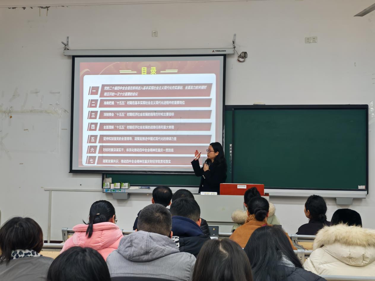 针对“十五五”时期这一关键发展阶段,房书记强调深刻领会这些顶层设计,是明确方向、凝聚共识的前提。聚焦“十五五”时期经济社会发展的战略任务与重大举措,引导教师们从更宏观的视野理解国家战略布局。房书记结合重庆发展实际,阐述了如何对标对表、深谋实干体系化推动四中全会精神落地生根。房书记强调学院专业背景与西部陆海新通道密切相关,在这一背景下要求学院专业和学生就业能力要深度融合。她进一步号召学院全体教师,要主动将学习贯彻全会精神与立德树人根本任务相结合,凝聚发展共识,将会议精神切实转化为推动学院高质量发展、服务地方经济社会建设的实际行动。