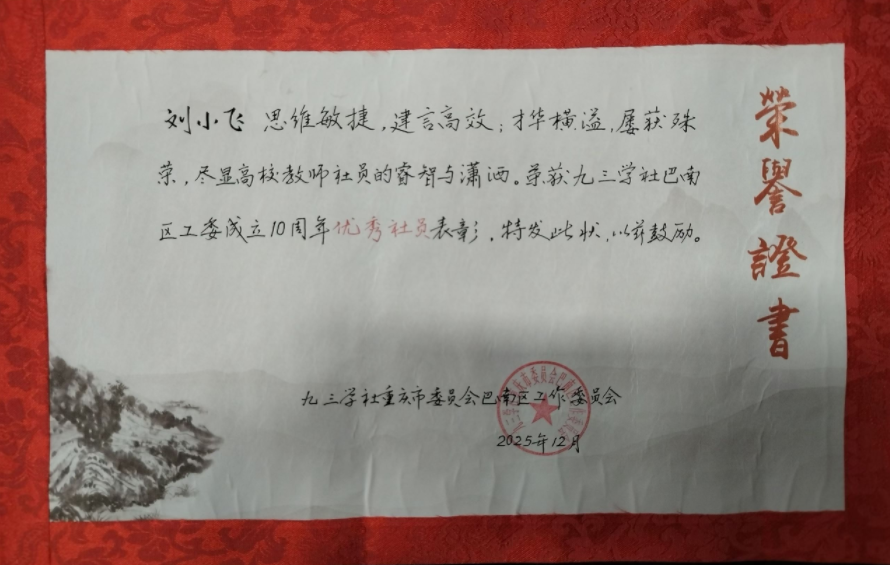 活动期间,对长期以来在参政议政、社会服务、本职工作中表现突出的先进个人进行了表彰。我校教师刘小飞、陈凤、兰静、李江娜、杨洋凭借其坚定的政治立场、突出的专业贡献和积极的社务参与,荣获“九三学社巴南区工委优秀社员”称号。这一荣誉不仅是对五位教师个人能力与奉献精神的充分肯定,也彰显了我校党外知识分子队伍建设的扎实成效和九三学社基层组织在我校的活力与凝聚力。