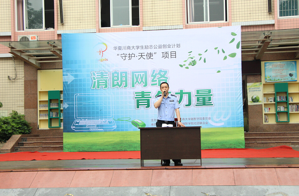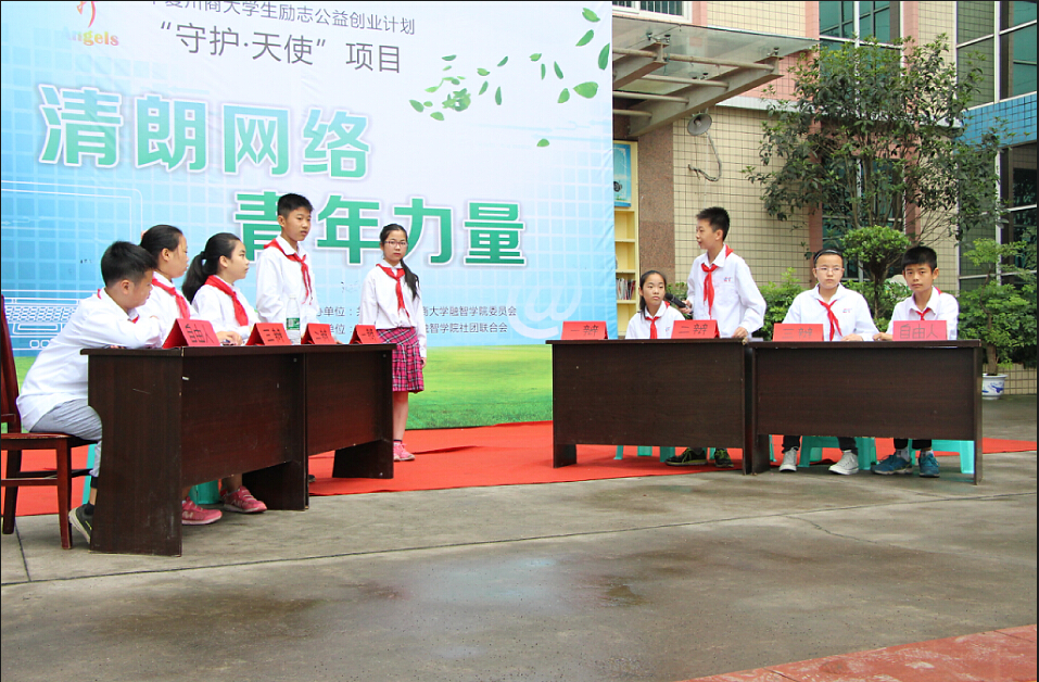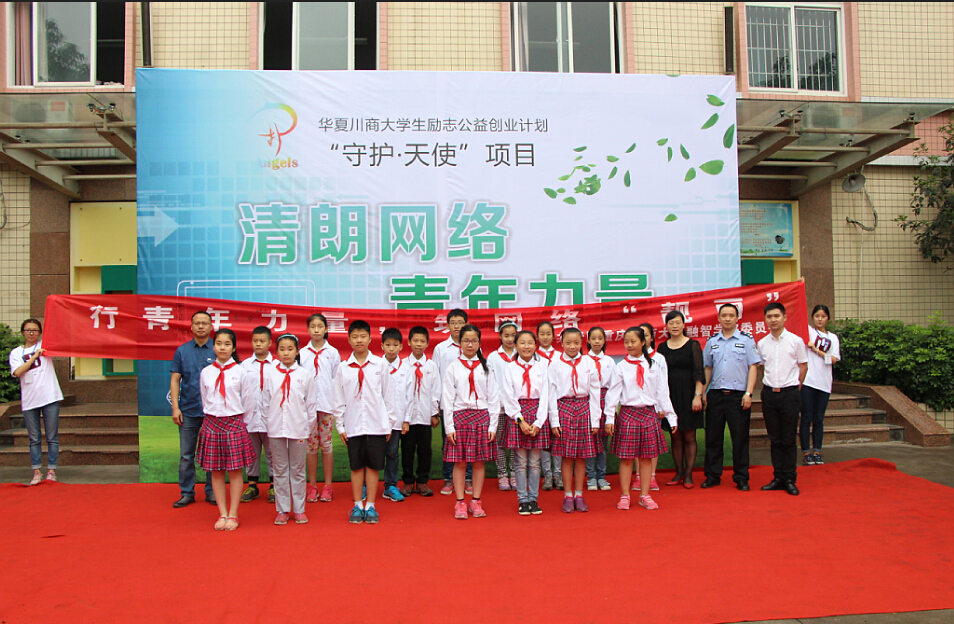 (通讯员 朱烨)2015年6月3日,由共青团重庆工商大学融智学院委员会主办,重庆工商大学融智学院社团联合会承办的“华夏川商大学生励志公益创业计划‘守护·天使’项目——清朗网络,青年力量”活动于二塘小学成功举行。二塘小学刘晓华书记、雷孟校长,井口派出所周华警官以及学院团委副书记李刚等出席本活动。