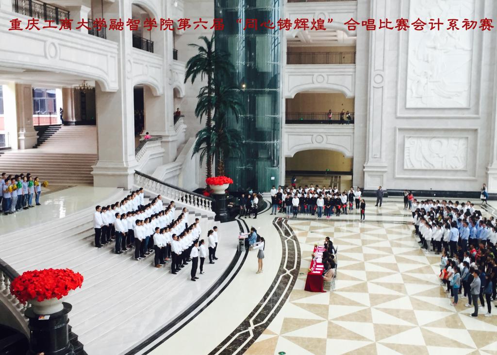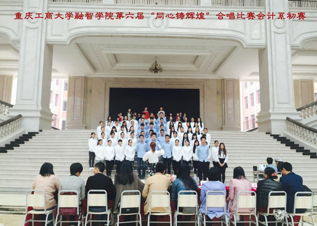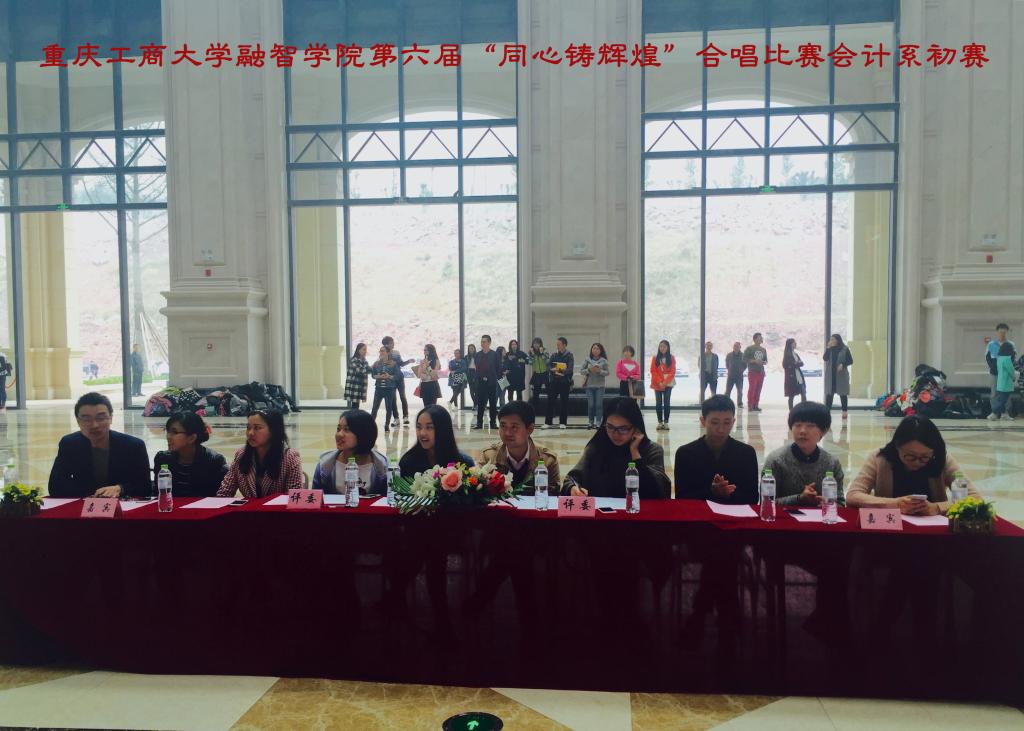 嘹亮歌声,筑梦青春。2015年11月4日中午,我院第六届“同心铸辉煌”合唱比赛会计系初赛在教学楼大厅正式拉开帷幕。本次比赛由学院团委副书记李刚、会计系专职辅导员谭白冰以及学院歌手大赛获奖选手代雯汐、孙若娉担任评委,会计系学团办主任李兰,来自会计系2015级各班级组成的八支合唱队伍参加了本次比赛。