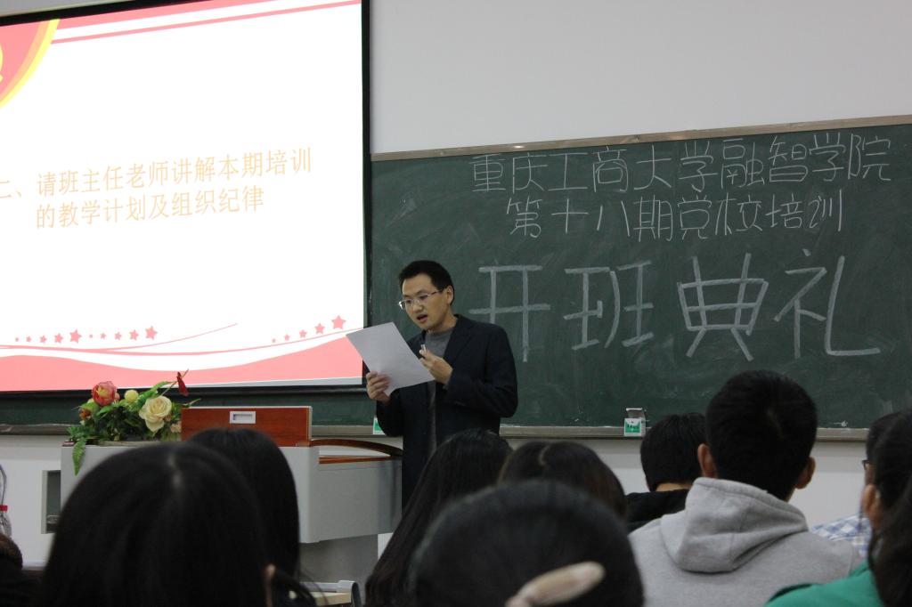 (通讯员 金佳倩)2015年11月13日12:20,我院第十八期党的知识培训班开班典礼在1306教室举行。党委书记丁广龙、党委副书记陈龙国、院长助理兼学生处处长李果,经济系党总支副书记李红平、金融系党总支副书记唐川川、信息工程系党总支副书记李喆、教辅一党支部书记李军,教辅三党支部书记唐立力、党群工作部副部长钟定华出席。开班典礼由党群工作部副部长倪倩茜主持。