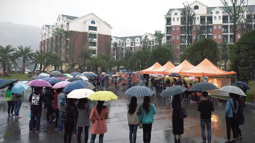 尽管阴雨连绵,我们的宣传队伍丝毫不惧,在雨中向同学们宣传活动。在这样的气氛中,许多人也冒着大雨驻足观看和报名,俨然有一种“就算大雨让这座城市颠倒,我也不会奔跑”的即视感。