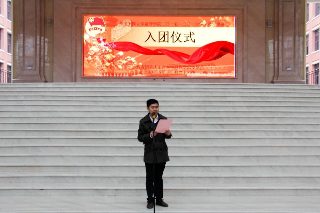(通讯员 江佩琳)2015年11月26日12:10 ,重庆工商大学融智学院新团员入团仪式在教学楼二楼大厅顺利举行。管理工程系学团办主任王玲艳、信息工程系学团办主任乐晓勇以及团委副书记李刚应邀出席本次大会。