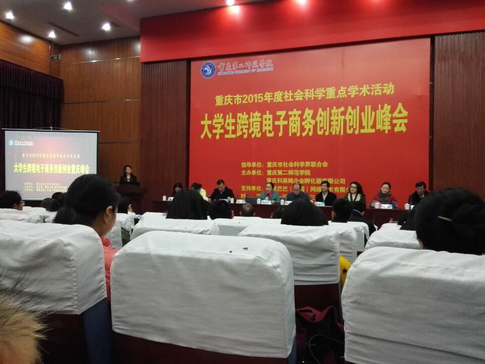 12月3日,重庆市2015年社会科学学术活动---大学生跨境电子商务创新创业峰会在重庆第二师范学院南山校区成功召开。我院商务系专职教师王草及学生代表参与了此次峰会。该峰会由重庆社会科学界联合会指导,重庆第二师范学院以及重庆科莱姆企业孵化器有限公司主办,得到阿里巴巴(中国)网络技术有限公司大力支持。重庆市对外贸易经济委员会电子商务处处长冉渝佳,阿里巴巴网络技术有限公司经理余先春,重庆服务外包协会电子商务研究所所长沈红兵等受邀出席本次峰会。中关村西部创客空间等18家企业、来自全国的二十余所高校领导、老师和学生代表参加了此次峰会。