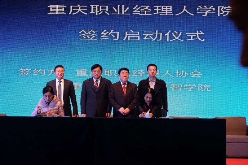 中国职业经理人协会会长洪虎、重庆职业经理人协会会长卢晓钟、重庆工商大学融智学院院长柏群签署成立“中国职业经理人协会重庆信用研究中心”合作协议;重庆职业经理人协会秘书长沈烈蓉、重庆工商大学融智学院院长柏群签署成立“重庆职业经理人学院”合作协议,并分别为中国职业经理人协会重庆信用研究中心和重庆职业经理人学院揭牌。中国职业经理人协会副会长史绥德、重庆职业经理人协会副会长王崇举、重庆工商大学融智学院副院长吴华安等在场400余名各界嘉宾共同见证了这一历史时刻。