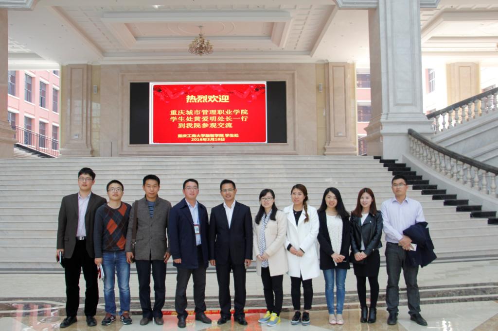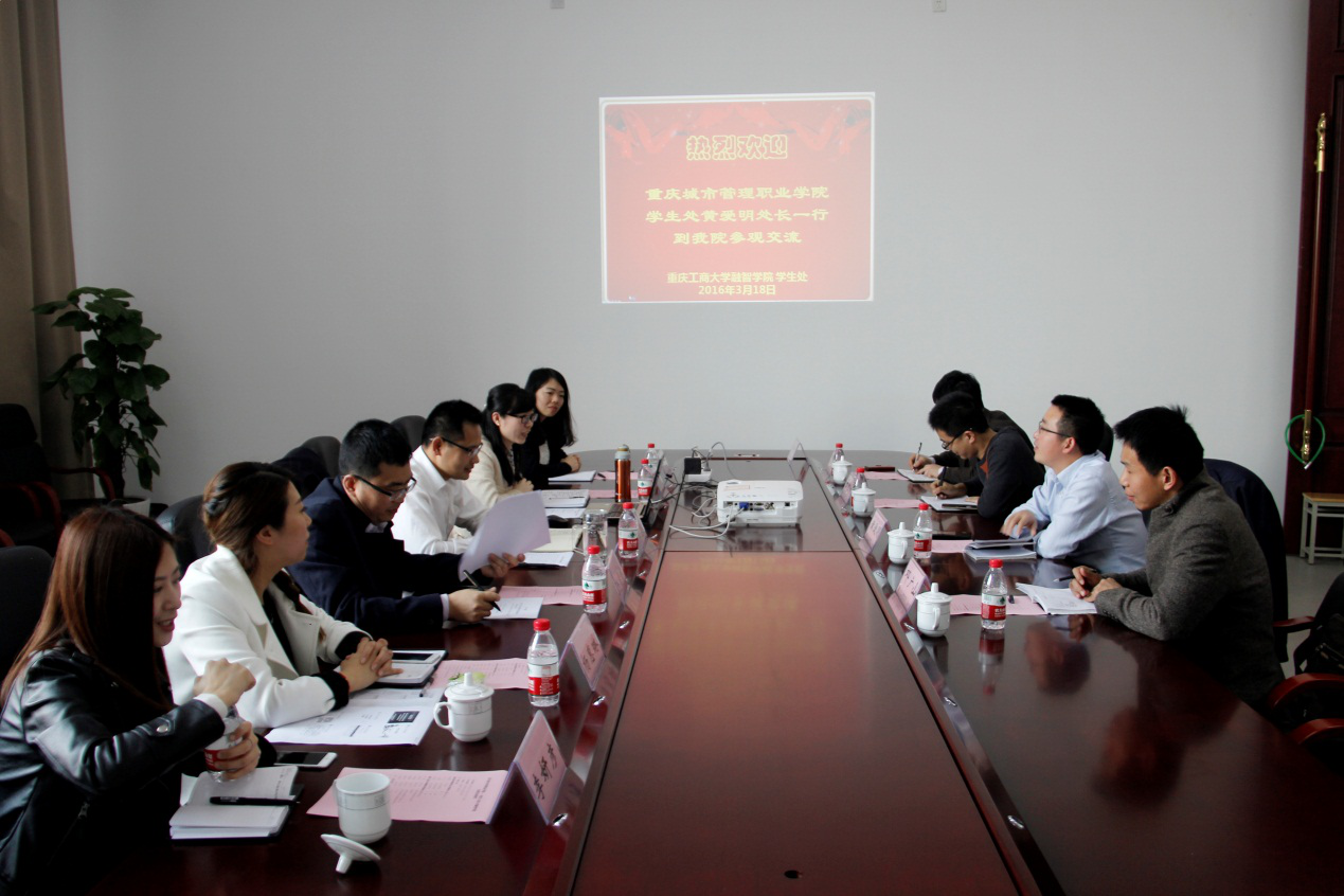 2015年3月18日下午,重庆城市管理职业学院学生处黄爱明处长一行到我院参观交流,我院院长助理兼学生处处长李果,学生处副处长姚转花以及学生处老师亲切接待并陪同参观。