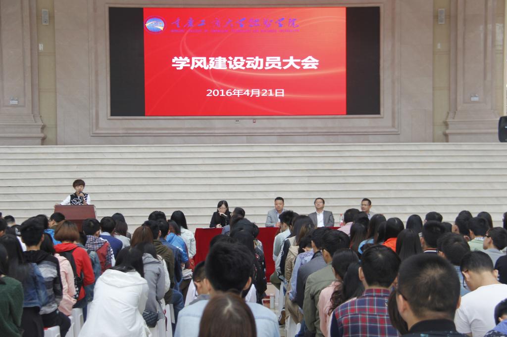 随后,姚转花副处长对《重庆工商大学融智学院学风建设实施方案》作了详细的解读,包括召开学风建设动员大会、开展“读书月”系列活动、开展学生帮扶活动、开展职业生涯规划活动等共十四条工作事项。紧接着由学生代表詹万清发言。他作为学生干部不仅严格要求自己,并号召同学们积极参与学院组织的各项学风建设活动,做到“学风建设我知晓、我参与、我受益”这样才能更好地促进我院学风建设工作的开展。后,辅导员代表陈倩茹老师发言。她通过慷慨激昂的演讲赢得阵阵掌声,她告诉在场的师生,学风建设不是一个人的事,不仅需要教师的引领,辅导员尽心尽力的付出和言传身教,更需要每个学生发挥主动性,成为学风建设的主体在学习的海洋中找到健康积极向上的自己。
