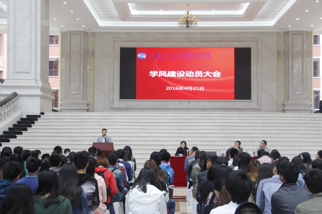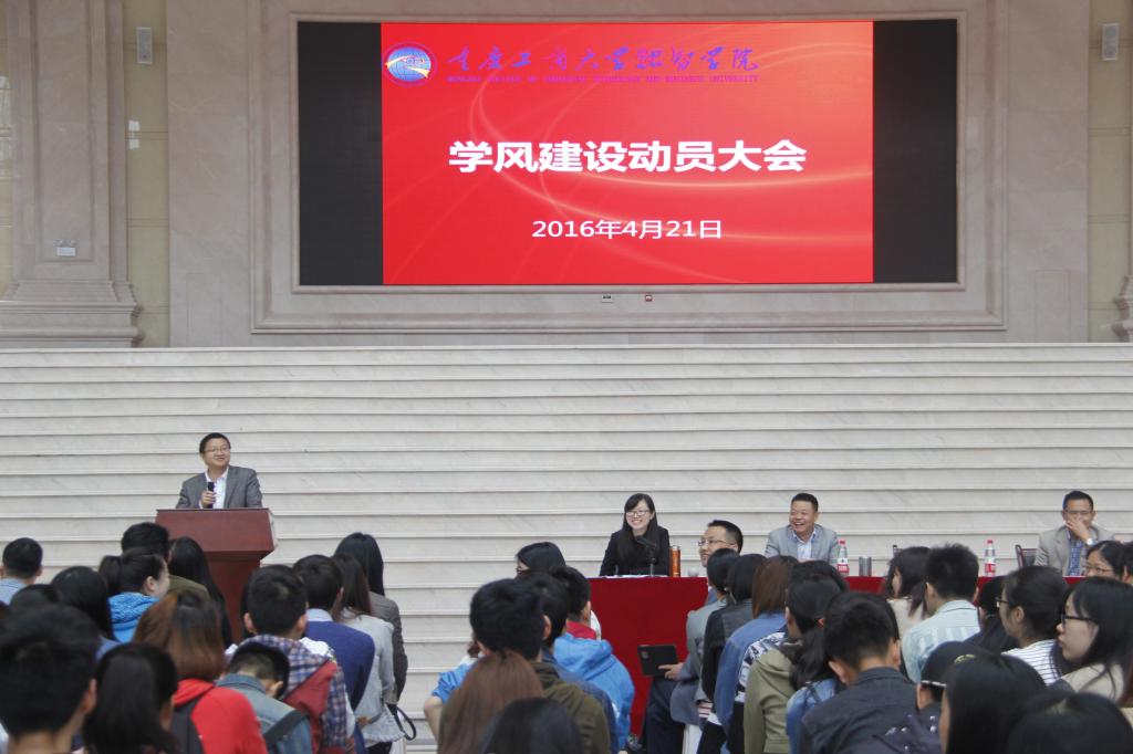 通讯员 张洪果 唐龙)为切实加强我院学风建设,树立良好的学习风气,激发学生的进取意识,我院于2016年4月21日中午在教学楼二楼大厅顺利召开了学风建设动员大会。院党委副书记陈龙国、副院长吴华安、院长助理兼学生处处长李果、学生处副处长姚转花、各系党总支副书记、教务处老师代表及各系辅导员出席,各学生组织主席、各班班长、团支书参加了本次会议。大会学生处副处长姚转花主持。