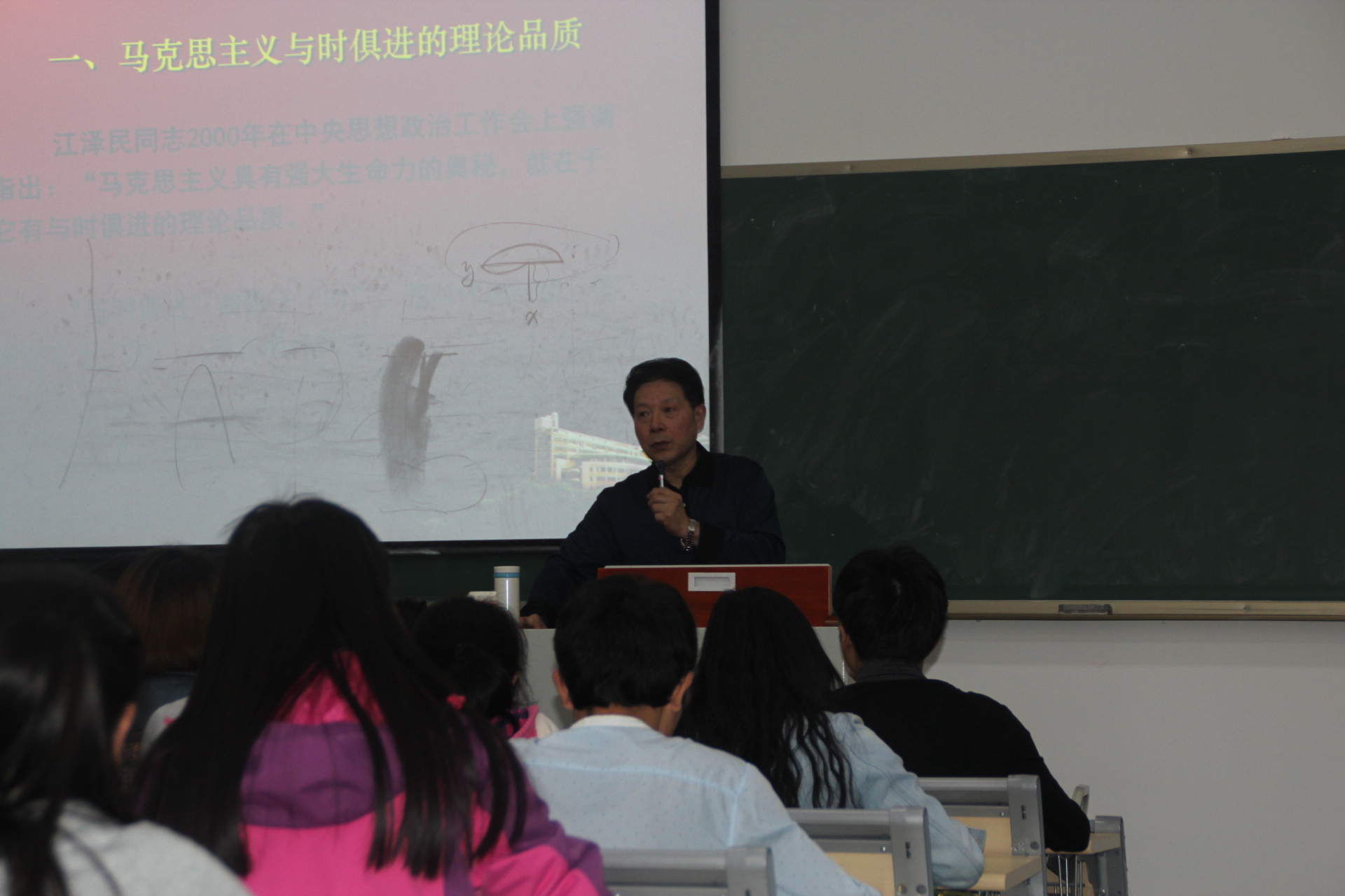 周希贤教授以“中国共产党的指导思想”为脉络,为学员们简单阐述了马克思主义、列宁主义、毛泽东思想的内涵,并以提问的方式与各位学员进行短暂的交流。紧接着,又详细的为学员们中国特色社会主义理论体系的三个发展阶段和三大理论成果。周希贤教授用生动的案例、幽默的语言,将理论性的知识讲得深入浅出、引人入胜,课堂上不时发出学员们欢快的笑声,气氛活跃,互动积极。课堂最后,周教授勉励全体学员,高举中国特色社会主义伟大旗帜,坚持以马克思列宁主义、毛泽东思想、邓小平理论和“三个代表”重要思想为指导,深入贯彻落实科学发展观,为建设富有中国特色的社会主义而奋斗。