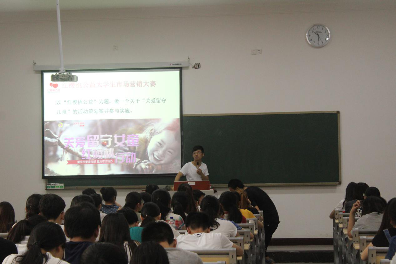 作为重庆市第一所举办“红樱桃公益大学生营销大赛”宣讲会的学校,我们邀请了红樱桃义工协会的负责人曾鹏老师来为参赛选手讲解,内容主要有以下几点:公益活动策划案基本要求、爱心产品义卖基本要求、方案成果展示基本要求。此次活动鼓励大学生为关爱留守儿童而努力营销,销售越多,付出的爱心越多。参赛选手通过校内初赛、重庆市复赛以及决赛三个环节评选出一、二、三等奖,分别给予3000元、2000元、1000元奖金以及相应证书。获奖团队还将代表学校参与到后期的爱心小鹅的捐赠活动中,赴深山为留守儿童和贫困家庭送去关爱。
