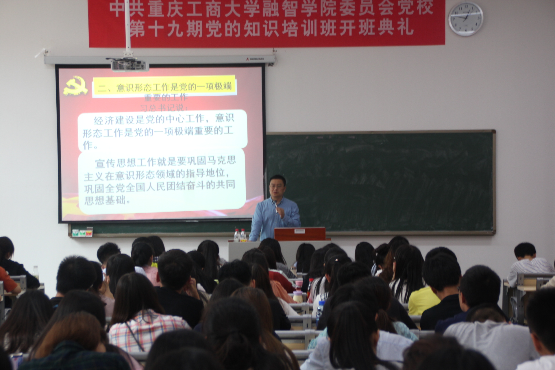在课堂上,丁书记以“入党积极分子应关注意识形态的几个问题”为题,首先用什么是意识激发同学们的思考,接着以魏则西事件和嫖娼大学生雷阳的死亡时事热点引领同学们进一步了解意识的深层含义。随后,丁书记让同学们观看了习近平书记的谈话,并结合一些切实案例,进而让大家明白经济建设是党的中心工作,意识工作更是党的一项极其重要的工作内容。最后,丁书记呼吁学员要高举中国特色社会主义的伟大旗帜,坚持马克思主义同中国实际相结合,早日加入到到党的建设中来。