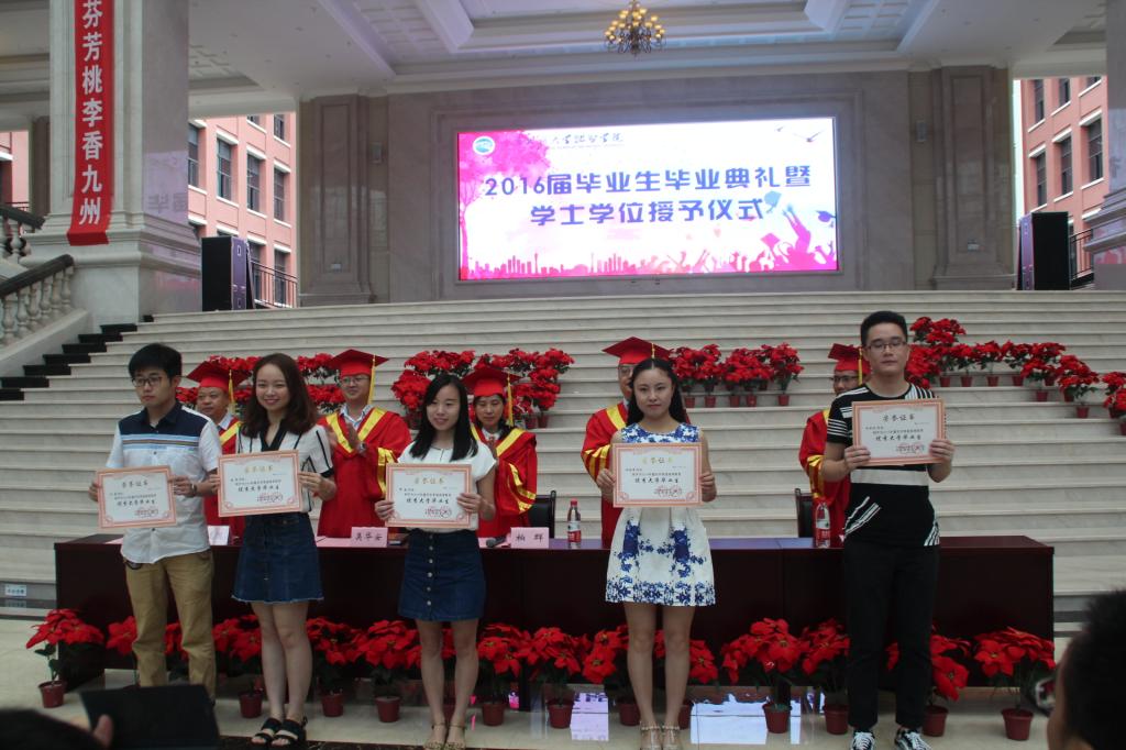 在庄严肃穆的国歌——《义勇军进行曲》歌声中,本次毕业典礼暨学位授予仪式正式拉开帷幕。首先,丁书记宣读了《重庆市教育委员会关于表彰2016年普通高等教育优秀大学毕业生的通报》、《关于表彰2016届优秀毕业生的决定》和《关于对乐耀等 27 名考取硕士研究生的2016届毕业生予以奖励的决定》,随后,院领导们分别为以上受表彰的毕业生代表们颁发了荣誉证书和奖励,并勉励他们今后继续奋发努力,为国家和社会贡献力量。