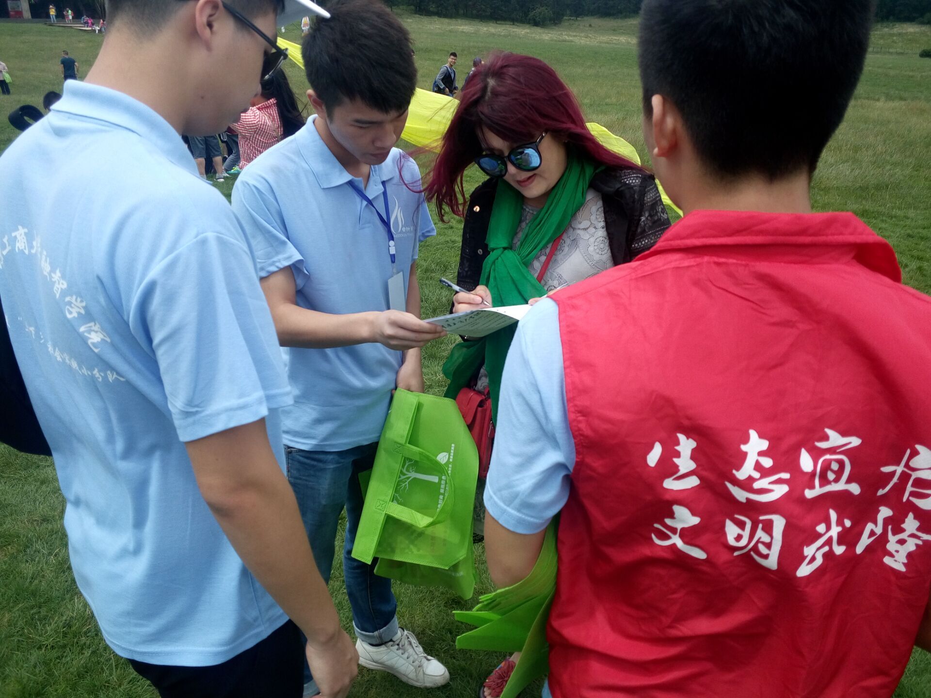 在活动中,志愿者们对当地居民及游客进行环保科普知识宣传并做了环保调查问卷,同时向参与者免费发放环保袋和环保宣传册,环保宣传与号召得到了广大群众积极的响应。随后,志愿者们和夏令营小朋友组成了环保大军,开展了“手拉手争当环保使者,心连心共创美丽中国”的公益活动,大学生志愿者带领小朋友们一起在绿色的大草原清理垃圾,双方通过游戏,寓教于乐地对环保进行宣传。他们在实践中收获默契,放飞环保理念,共同传承优良传统美德。在游戏中不仅增进了志愿者与小朋友之间的友谊,同时加深了大家的环保意识和理念。
