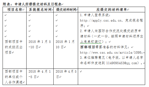 2018年,西部项目统一安排成班派出项目申报时间为1月5 -10日,派出时间接受国家留学基金委统筹安排,派出期间不允许携带家属。