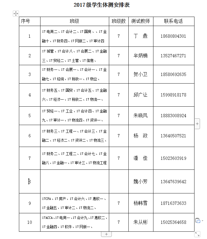 1.请各班班长或体育委员于4月12日前主动与测试教师取得联系,并预约好测试时间(教师电话见体测安排表)。