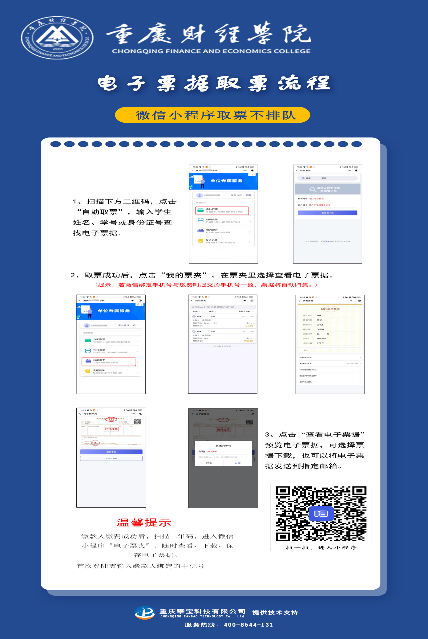 为方便同学们缴费,学校于2022年8月1日启用全新的收费系统和电子票据系统,缴费页面简洁明了,操作更便捷。同学们可在缴费成功后自主开票和取票,极大提升了同学们缴费和开票的便利性。具体操作如下: