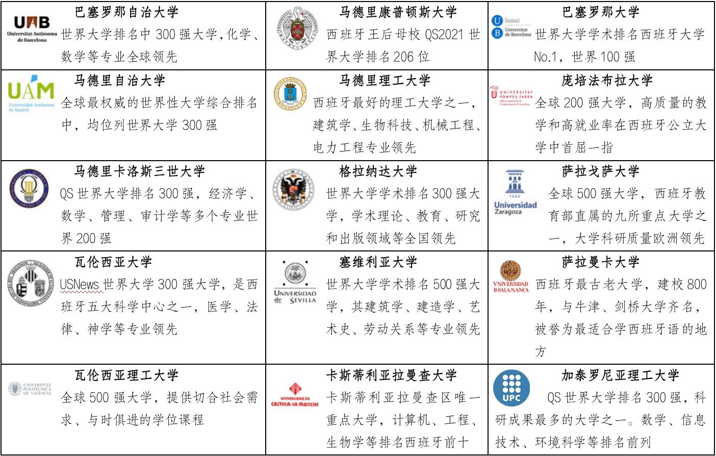 项目学制:3+2本科-硕士连读;国内大学就读3年、西班牙公立大学就读2年;