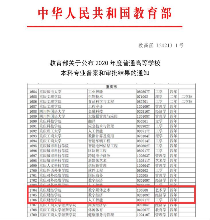 近日,教育部下发了《教育部关于公布2020年度普通高等学校本科专业备案和审批结果的通知》( 教高函〔2021〕1号 ),我校于2021年新增“数字媒体艺术”、“数字经济”、“人工智能”三个专业。其中“数字媒体艺术”专业授艺术学学士学位,至此,学校学科门类突破艺术学,普通本科专业数达到38个。