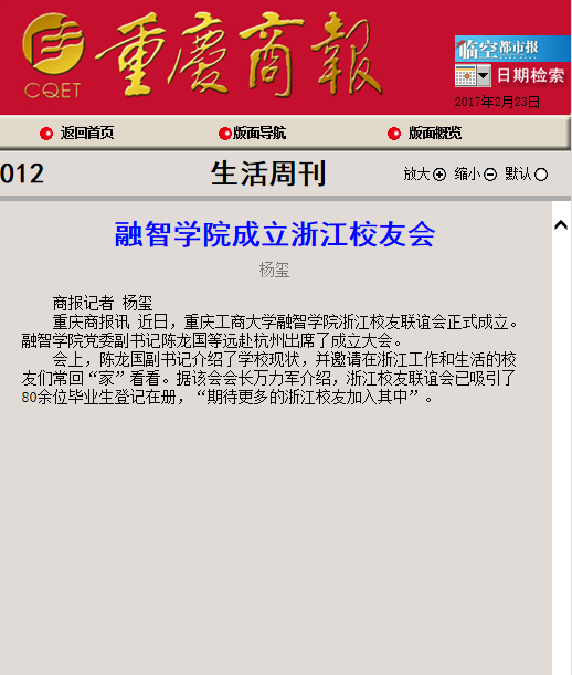 重庆商报2月23日讯(记者 杨玺)近日,重庆工商大学融智学院浙江校友联谊会正式成立。融智学院党委副书记陈龙国等远赴杭州出席了成立大会。