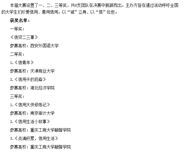 本届大赛设置了一、二、三等奖,共6支团队在决赛中脱颖而出。主办方旨在通过活动呼吁全国的大学生们珍爱信用、善用信用,以“诚”立身、以“信”处世。