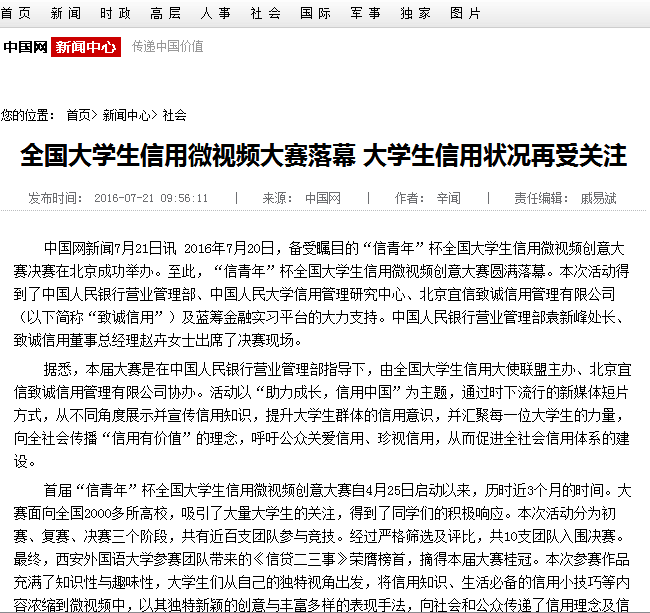 中国网新闻2016年7月21日讯(记者:辛闻)2016年7月20日,备受瞩目的“信青年”杯全国大学生信用微视频创意大赛决赛在北京成功举办。至此,“信青年”杯全国大学生信用微视频创意大赛圆满落幕。本次活动得到了中国人民银行营业管理部、中国人民大学信用管理研究中心、北京宜信致诚信用管理有限公司(以下简称“致诚信用”)及蓝筹金融实习平台的大力支持。中国人民银行营业管理部袁新峰处长、致诚信用董事总经理赵卉女士出席了决赛现场。