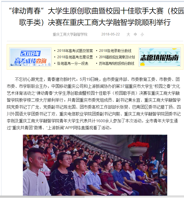不忘初心跟党走,青春建功新时代。5月19日晚,由市委宣传部、市委教育工委、市教委、团市委、市学联联合主办,中国移动重庆公司和上游新闻协办的第37届重庆市大学生“校园之春”文化艺术体育活动之“律动青春”大学生原创歌曲暨校园十佳歌手(校园歌手类)决赛在重庆工商大学融智学院教学楼二楼大厅顺利举行。共青团重庆市委党组成员、副书记黄永宜、重庆工商大学融智学院党委书记丁广龙、党委副书记陈龙国、团市委高校工作部部长张斐、巴南团区委书记腊丁扬、四川外国语大学团委书记丁欢、重庆电信职业学院团委副书记向毅、重庆工商大学融智学院团委书记李刚及重庆工商大学融智学院青年大学生代表共计1600余人参加了本次活动,全市青年大学生通过“重庆共青团”微博、“上游新闻”APP网络直播观看了活动。
