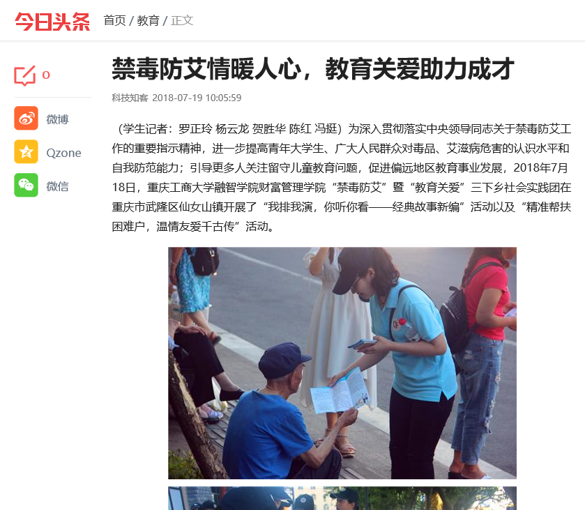 (学生记者:罗正玲 杨云龙 贺胜华 陈红 冯挺)为深入贯彻落实中央领导同志关于禁毒防艾工作的重要指示精神,进一步提高青年大学生、广大人民群众对毒品、艾滋病危害的认识水平和自我防范能力;引导更多人关注留守儿童教育问题,促进偏远地区教育事业发展,2018年7月18日,重庆工商大学融智学院财富管理学院“禁毒防艾”暨“教育关爱”三下乡社会实践团在重庆市武隆区仙女山镇开展了“我排我演,你听你看——经典故事新编”活动以及“精准帮扶困难户,温情友爱千古传”活动。
