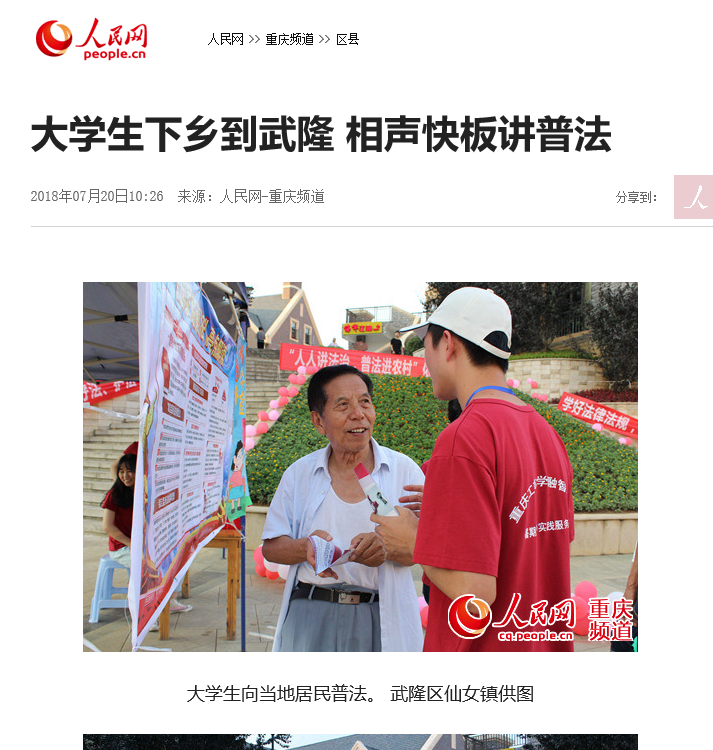 人民网重庆7月20日电 为更好地帮助基层群众知法、懂法、学法、用法,7月19日,重庆工商大学融智学院物流工程学院暑期“三下乡”社会实践依法治国宣讲团来到了武隆区仙女山镇,用丰富的表演形式,为当地父老乡亲进行了以“人人讲法制,普法进农村”为主题的法治宣讲。
