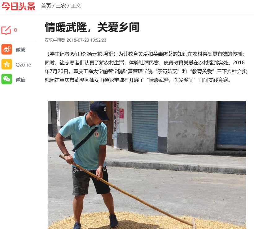 (学生记者:罗正玲 杨云龙 冯挺)为让教育关爱和禁毒防艾的知识在农村得到更有效的传播;同时,让志愿者们认真了解农村生活,体验社情民意,使得教育关爱在农村落到实处。2018年7月20日,重庆工商大学融智学院财富管理学院“禁毒防艾”和“教育关爱”三下乡社会实践团在重庆市武隆区仙女山镇龙宝塘村开展了“情暖武隆,关爱乡间”田间实践竞赛。