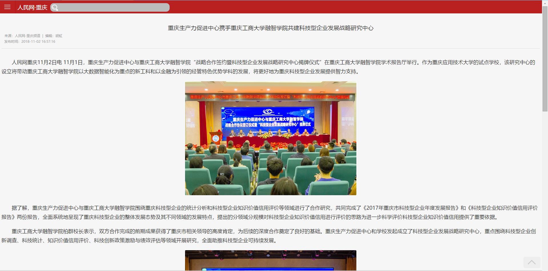 据了解,重庆生产力促进中心与重庆工商大学融智学院围绕重庆科技型企业的统计分析和科技型企业知识价值信用评价等领域进行了合作研究,共同完成了《2017年重庆市科技型企业年度发展报告》和《科技型企业知识价值信用评价报告》两份报告,全面系统地呈现了重庆科技型企业的整体发展态势及其不同领域的发展特点,提出的分领域分规模对科技型企业知识价值信用进行评价的思路为进一步科学评价科技型企业知识价值信用提供了重要依据。