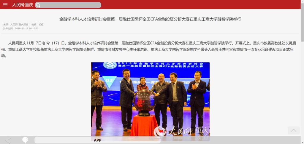 人民网重庆11月17日电 今(17)日,金融学本科人才培养研讨会暨第一届融仕国际杯全国CFA金融投资分析大赛在重庆工商大学融智学院举行。开幕式上,重庆市教委高教处处长蒋后强、重庆工商大学副校长兼重庆工商大学融智学院校长柏群、重庆市金融发展中心主任张洪铭、重庆工商大学融智学院金融学科带头人靳景玉共同宣布重庆市一流专业培育建设项目正式启动。