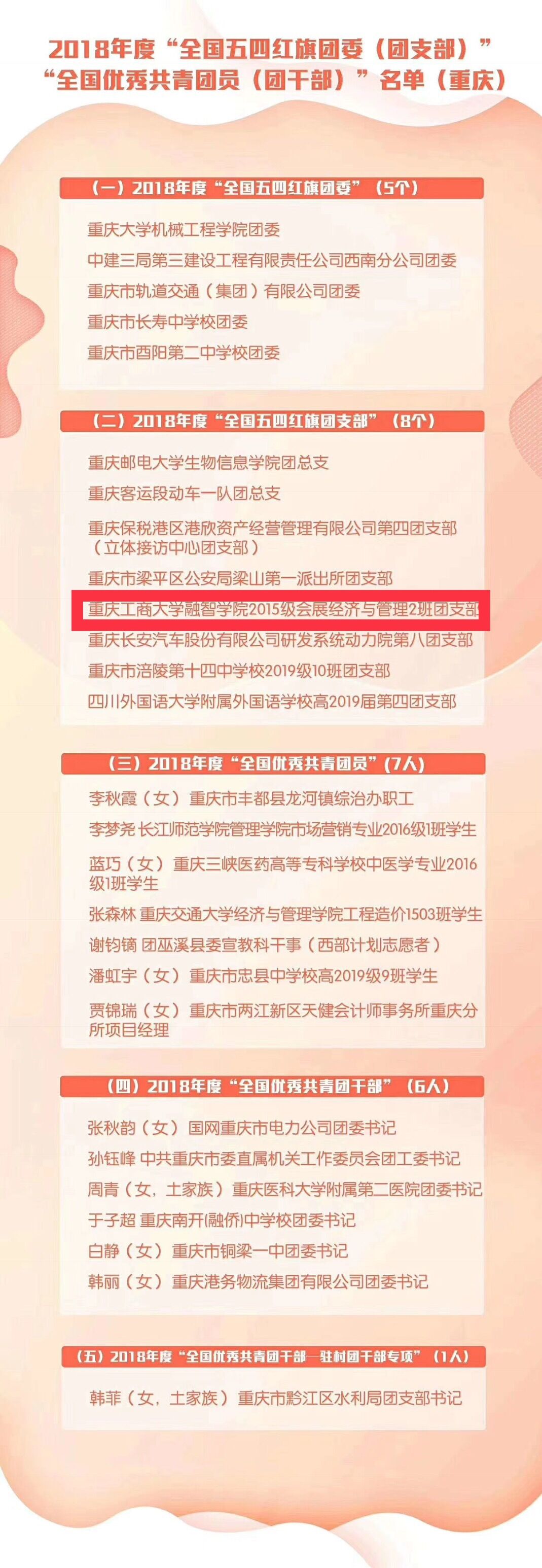 “重庆青年五四奖章”是全市青年的最高荣誉,“重庆市优秀共青团员”“重庆市优秀共青团干部”“重庆市五四红旗团委(团支部)”是全市团员青年、团干部和各级团组织的荣誉。2019年“重庆青年五四奖章”、2018年度“两红”“两优”评选自3月启动以来,历经组织推报、群众评议、专家评审、考察公示等环节,分别评比产生了10位受表彰个人、139个受表彰个人(集体),集中体现了当代重庆青年和团员青年、团干部、团组织崭新的时代风貌。