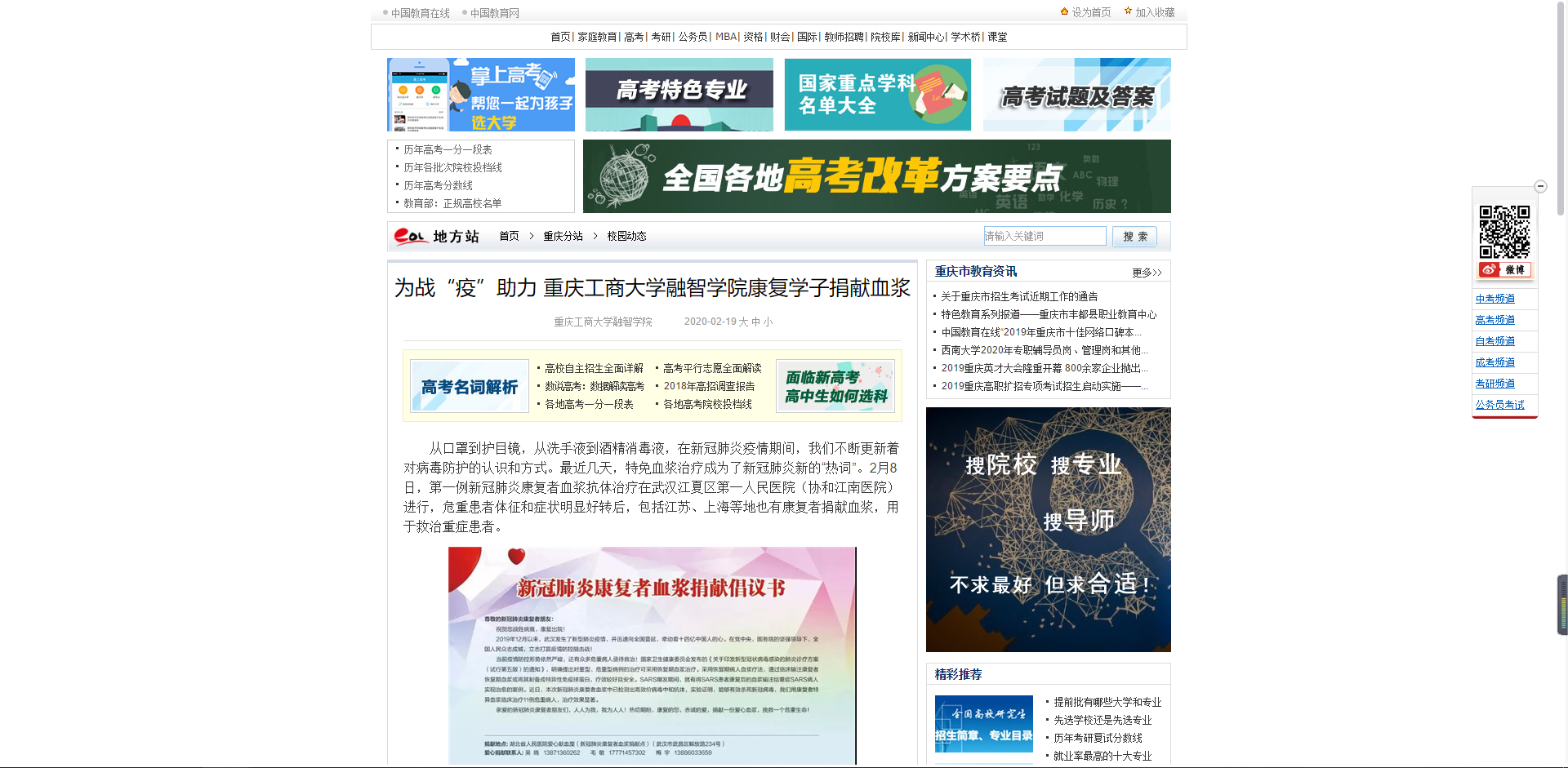 重庆工商大学融智学院信息工程学院2017级小王就是这样一名捐献血浆康复者,她于1月25日确诊,2月9日出院,医院征求她的意见之后在13日请她签署知情同意书,并完成了抽血。“之前在学校,我有一次去献血,结果由于身体条件被医生拒绝。”小王回忆,12日的时候,医院给她打电话,说有几个危重症患者,希望借鉴非典时候使用康复者血浆进行治疗的方式进行治疗。“家中当时只有我一个人适合献血,医生也说我在治疗时的身体状态不错,我本来也是年轻人,应该可以抽400cc血,如果能帮上忙,我是很愿意的。”