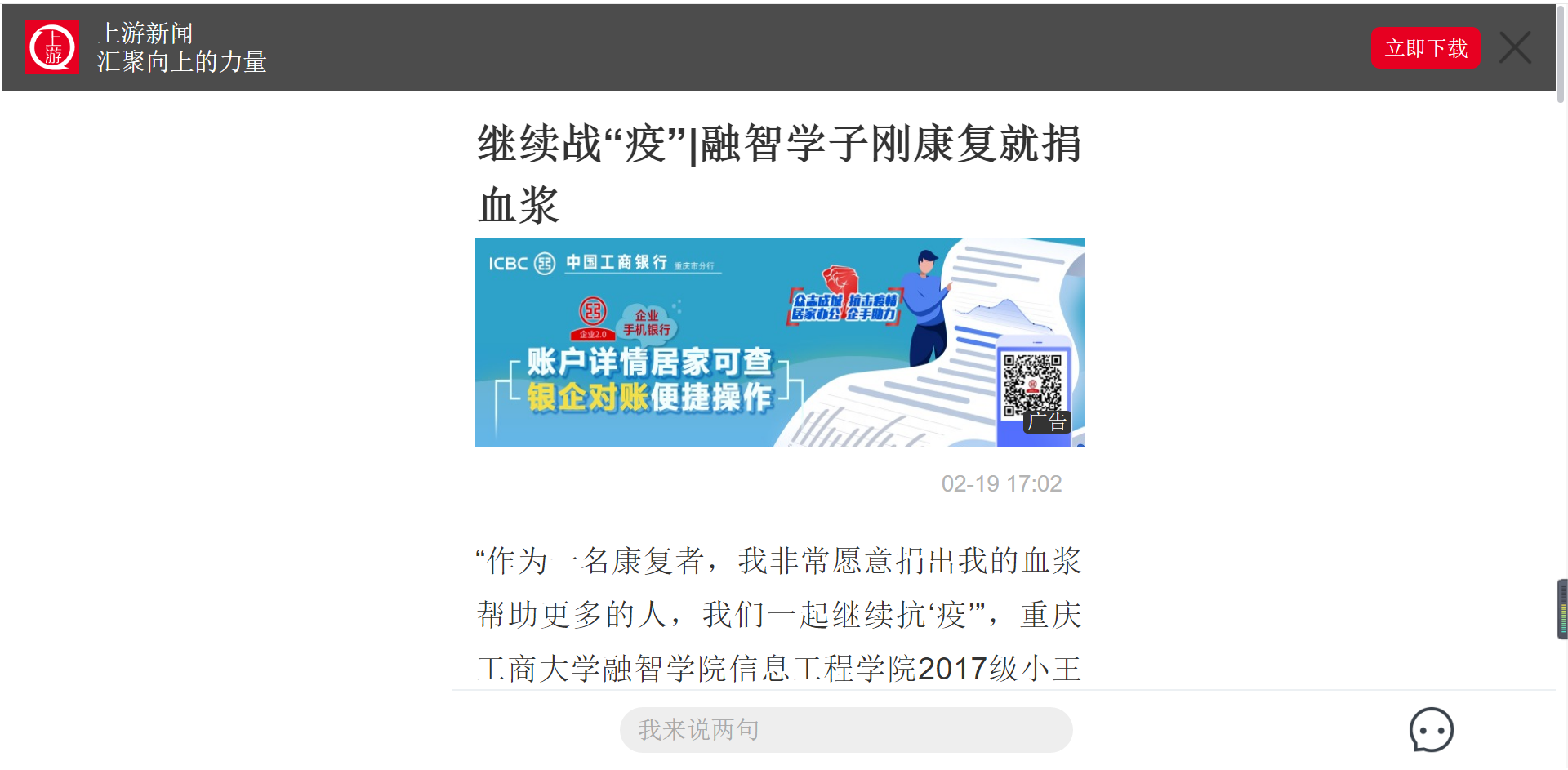 “作为一名康复者,我非常愿意捐出我的血浆帮助更多的人,我们一起继续抗‘疫’”,重庆工商大学融智学院信息工程学院2017级小王(化名)作为一名刚刚康复出院的患者,在签署了《新型冠状病毒肺炎患者应用恢复期患者血浆治疗献血人知情同意书》后,完成了抽血。