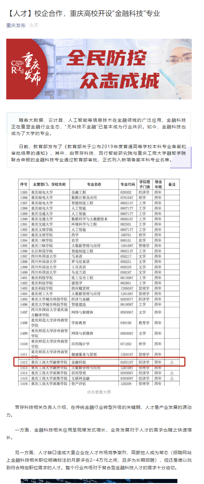 日前,教育部发布了《教育部关于公布2019年度普通高等学校本科专业备案和审批结果的通知》,其中,由誉存科技、百行智能研究院与重庆工商大学融智学院联合申报的金融科技专业通过教育部审批,正式列入新增备案本科专业名单。