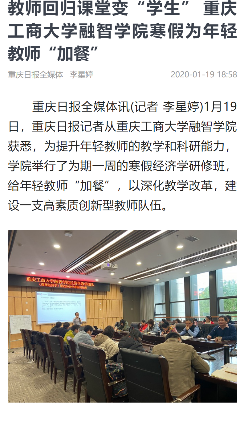 重庆日报全媒体讯(记者 李星婷)1月19日,重庆日报记者从重庆工商大学融智学院获悉,为提升年轻教师的教学和科研能力,学院举行了为期一周的寒假经济学研修班,给年轻教师“加餐”,以深化教学改革,建设一支高素质创新型教师队伍。