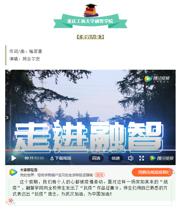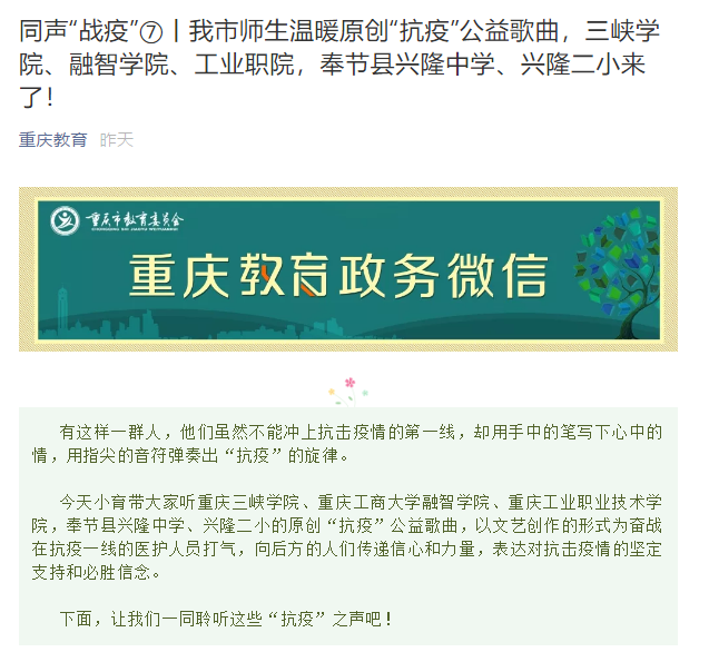 今天小育带大家听重庆三峡学院、重庆工商大学融智学院、重庆工业职业技术学院,奉节县兴隆中学、兴隆二小的原创“抗疫”公益歌曲,以文艺创作的形式为奋战在抗疫一线的医护人员打气,向后方的人们传递信心和力量,表达对抗击疫情的坚定支持和必胜信念。