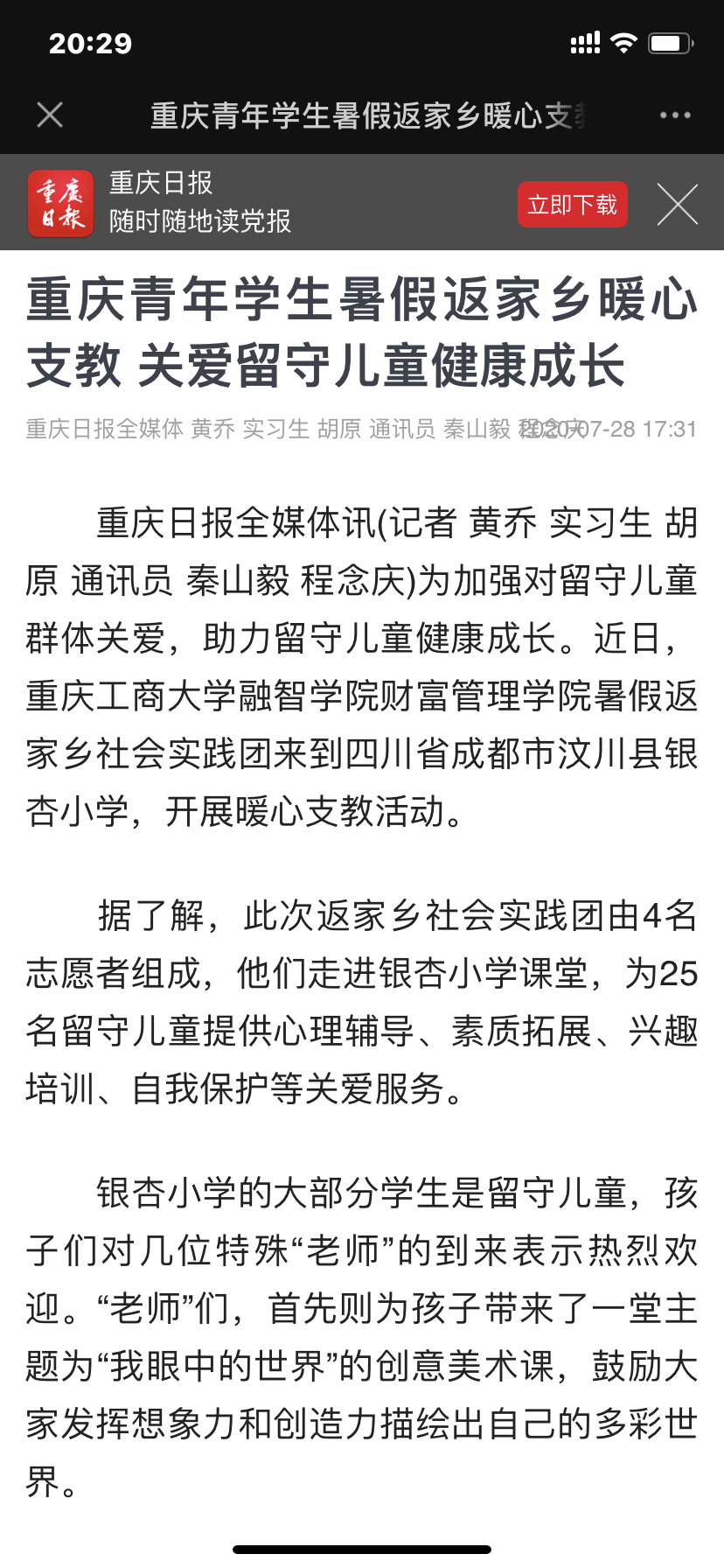 为加强对留守儿童群体关爱,助力留守儿童健康成长。近日,重庆工商大学融智学院财富管理学院暑假返家乡社会实践团来到四川省成都市汶川县银杏小学,开展暖心支教活动。