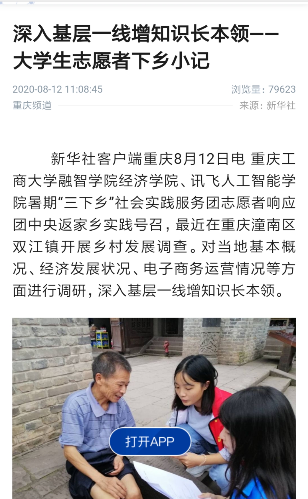 重庆工商大学融智学院经济学院、讯飞人工智能学院暑期“三下乡”社会实践服务团志愿者响应团中央返家乡实践号召,最近在重庆潼南区双江镇开展乡村发展调查。对当地基本概况、经济发展状况、电子商务运营情况等方面进行调研,深入基层一线增知识长本领。